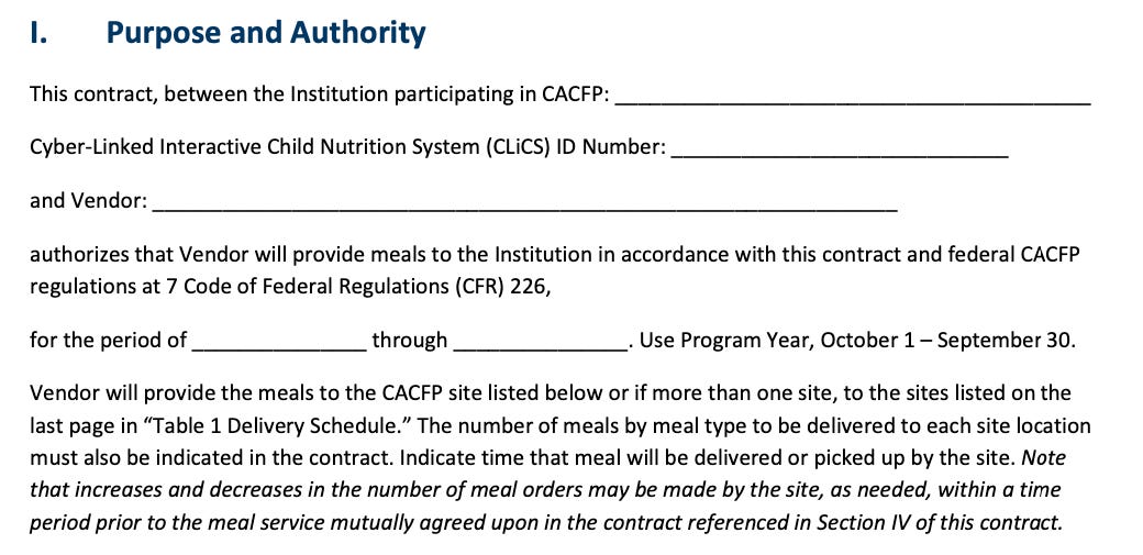 This is mirrored in the standard contract template MDE provides. The first screenshot is at the top of the contract and requires a CLiCS ID, which is only offered once the organization has a signed agreement with MDE to participate in CACFP as a multi-site or single-site sponsor.