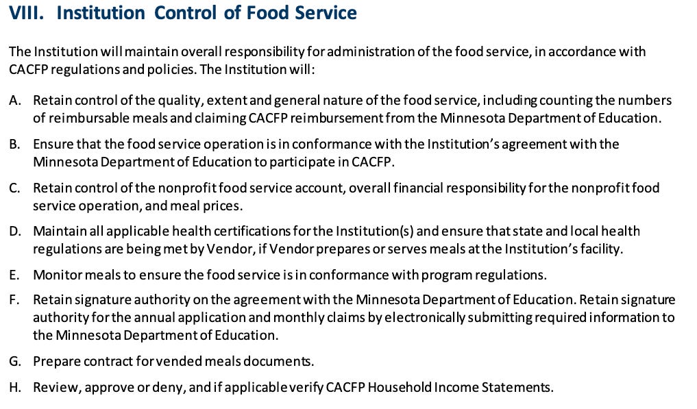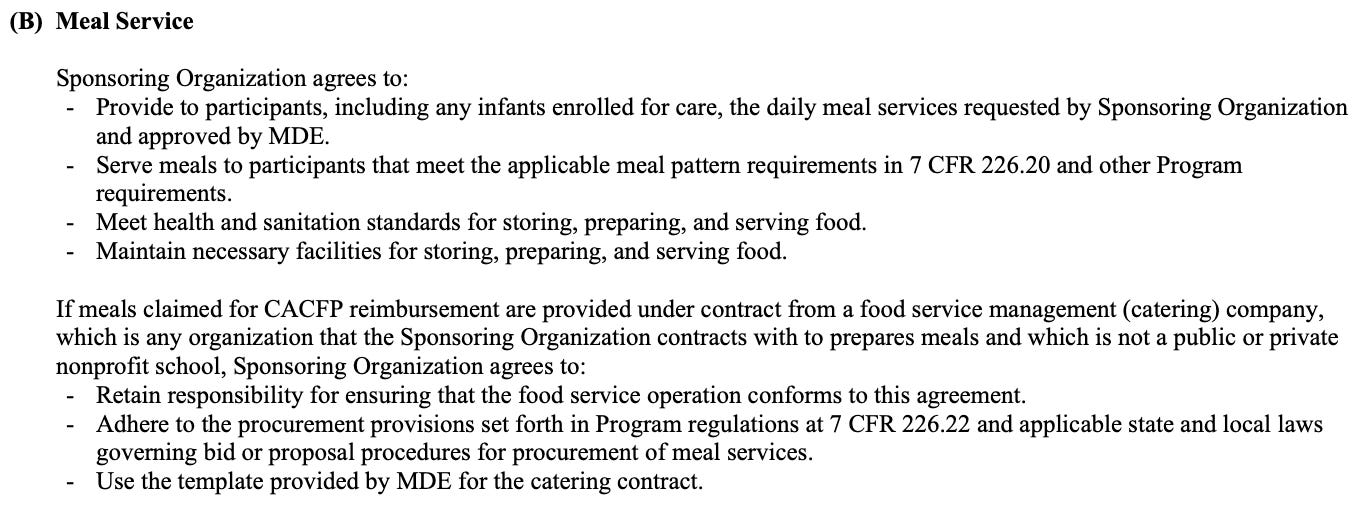 There are strict procurement rules within CACFP and SFSP, but it doesn’t appear these sponsors were following them. In the agreement, every sponsor must sign with the Minnesota Department of Education; it is clear that sponsors must retain responsibility over the catering companies. Below is the excerpted clause from the permanent agreement:
