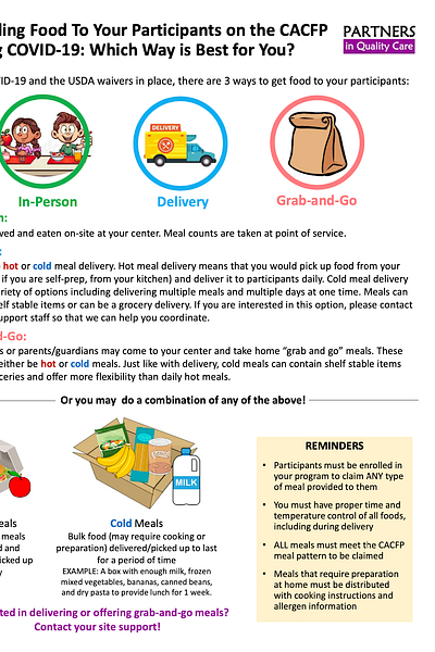 This flyer (download below) from Partners in Nutrition (PIN) introduces the concept of a cold meal composed of items that may require cooking or preparation. The flyer states, “Cold meal delivery allows a variety of options, including delivering multiple meals and multiple days at one time. Meals can contain shelf-stable items or can be a grocery delivery.”